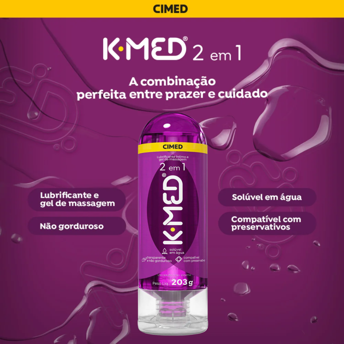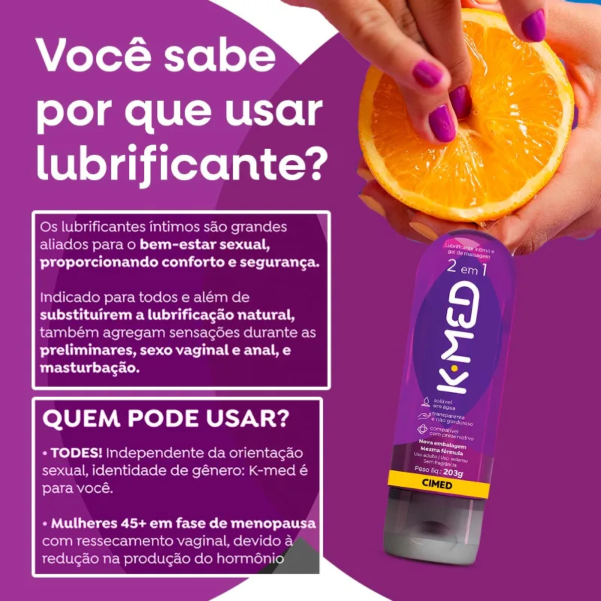 Kit 2 Gel Lubrificante Intimo K-Med 2 Em 1 Com 203g - Cimed O K-Med 2 em 1 Gel de desenvolvimento Íntimo e Gel de Massagem desenvolvido a base de água e vitamina e, que proporciona mais conforto, segurança e prazer durante a relação sexual. K-Med 2 em 1 serve tanto como embarque íntimo, quanto como gel massageador corporal. Pode ser usado com conservantes. Benefícios: Lubrificante íntimo, gel de massagem, a base de água, sem fragrância, facilmente conveniente, pode ser usado com conservantes, não contém contraindicações Imagens Meramente Ilustrativas. Todas as Informações Divulgadas são de Responsabilidade Exclusiva do Fabricante/fornecedor.
