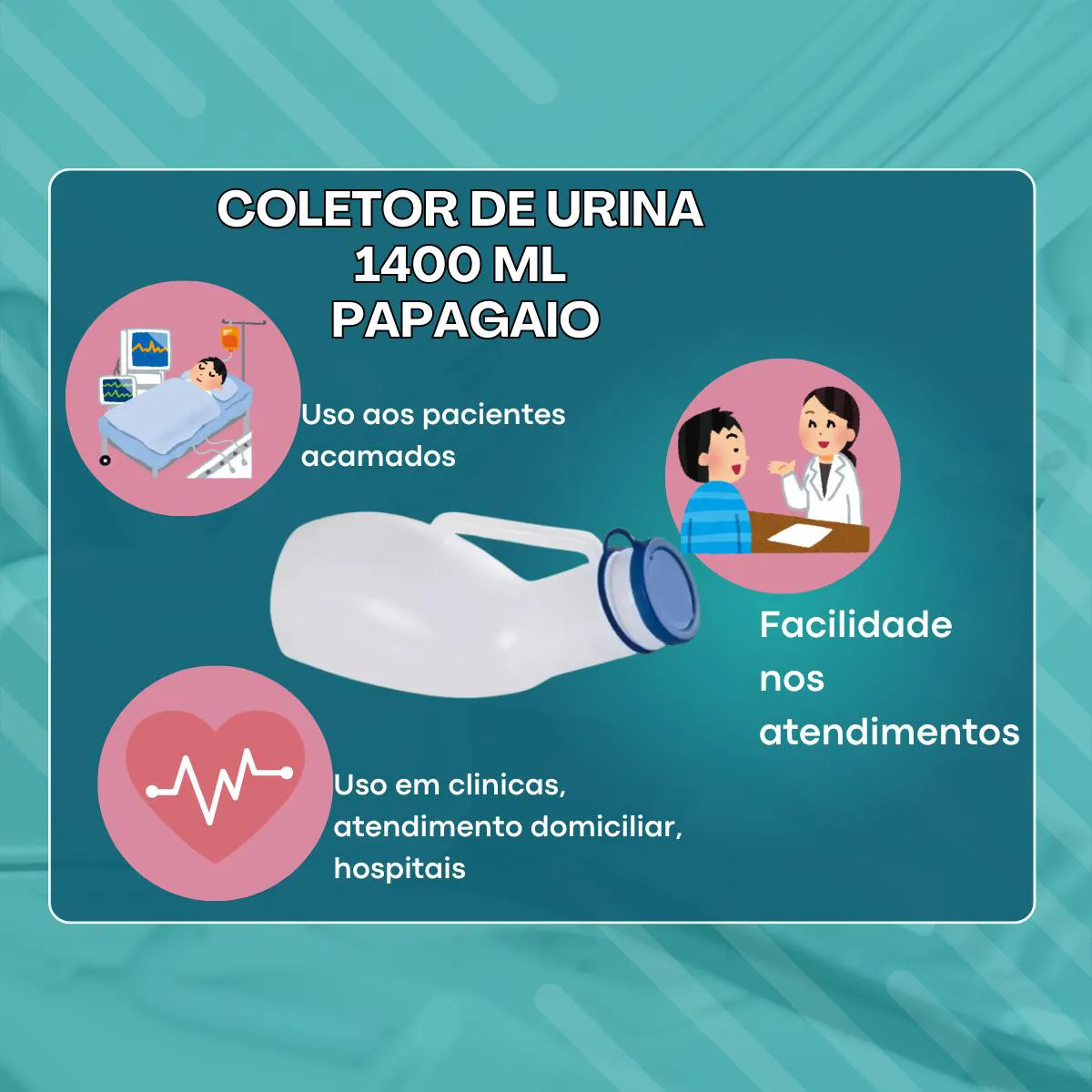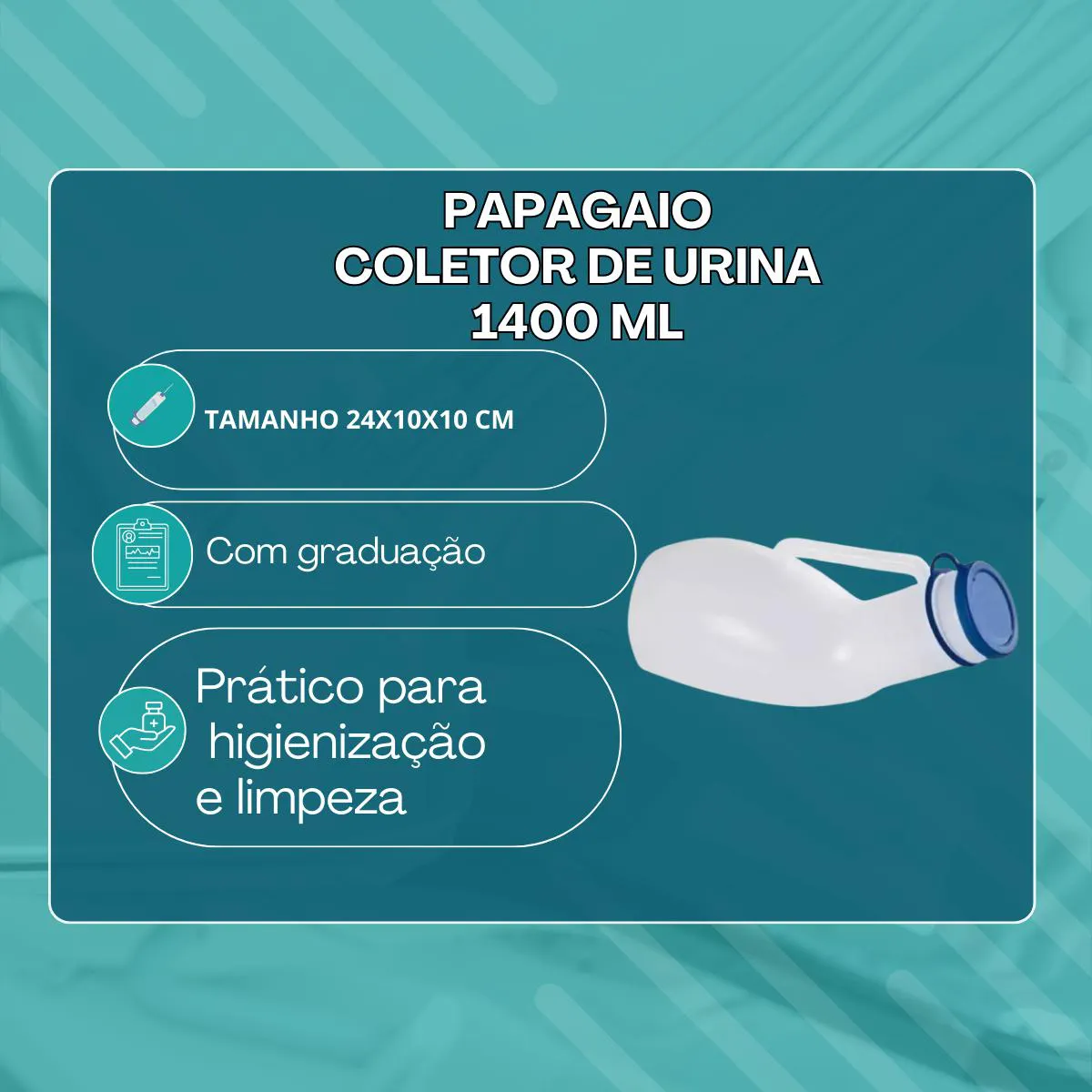 DESCRIÇÃO: O Papagaio plástico é indicado para urina em pacientes do sexo masculino, auxiliando os pacientes com mobilidade reduzida.AÇÃO/ATIVOS: O Papagaio Plástico com Tampa Descartável 1L foi criado em plástico comprometido de mais alta qualidade, desenvolvido a partir do conceito de Home Care, agregando conforto e segurança ao paciente prejudicado o risco de infecção. MODO DE USAR: Colocar o papagaio na melhor posição o órgão masculino deverá ser introduzido no papagaio; ESTE ANÚNCIO CONTÉM: 01 UNIDADE DE PAPAGAIO C/ TAMPA 1,4 L